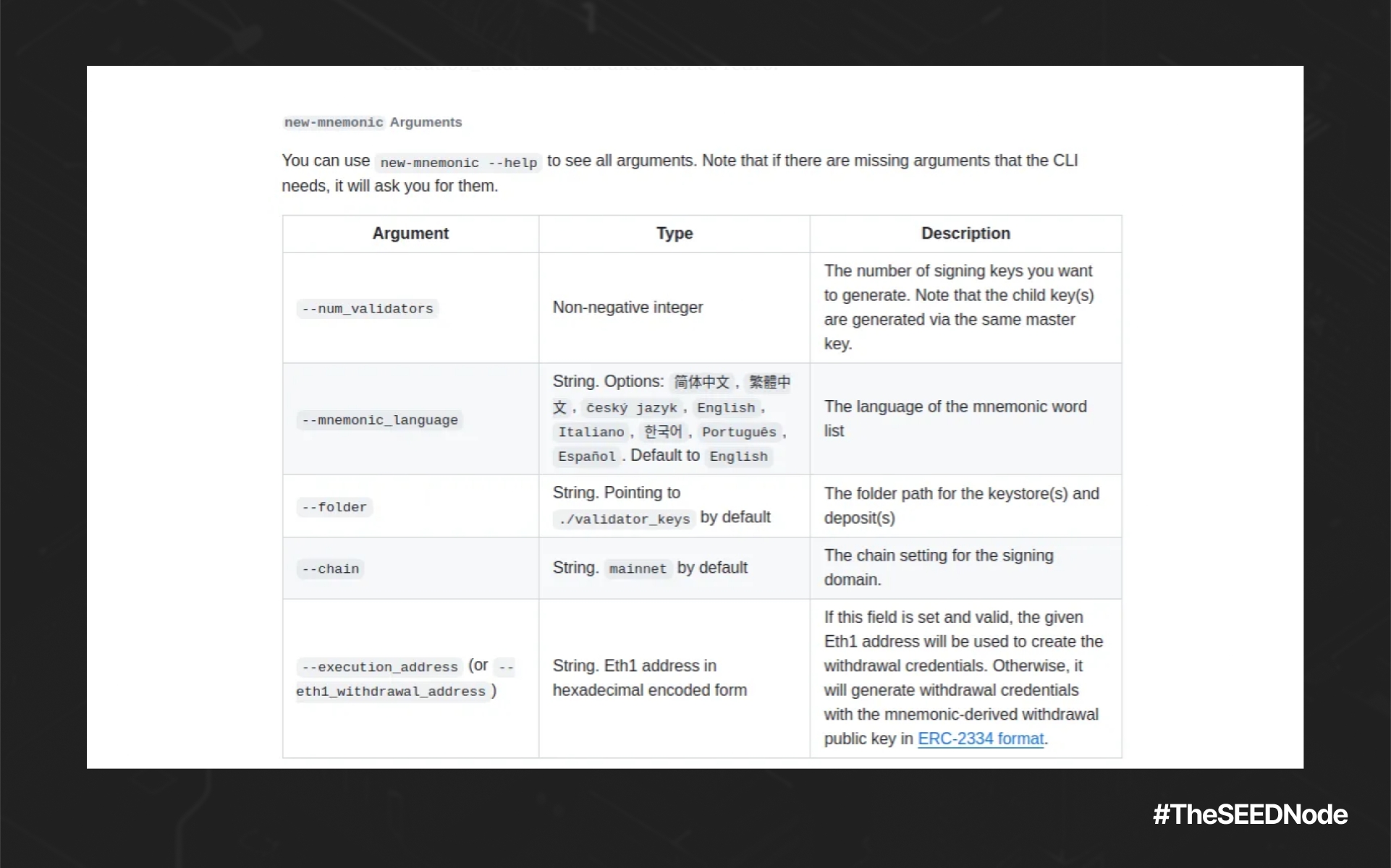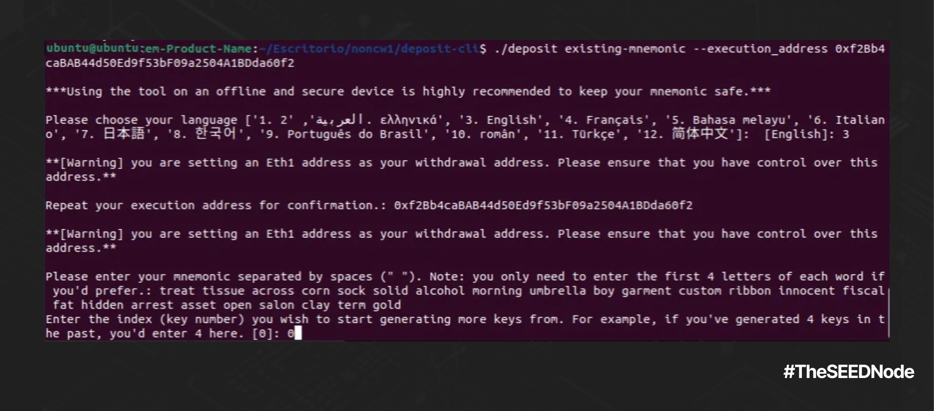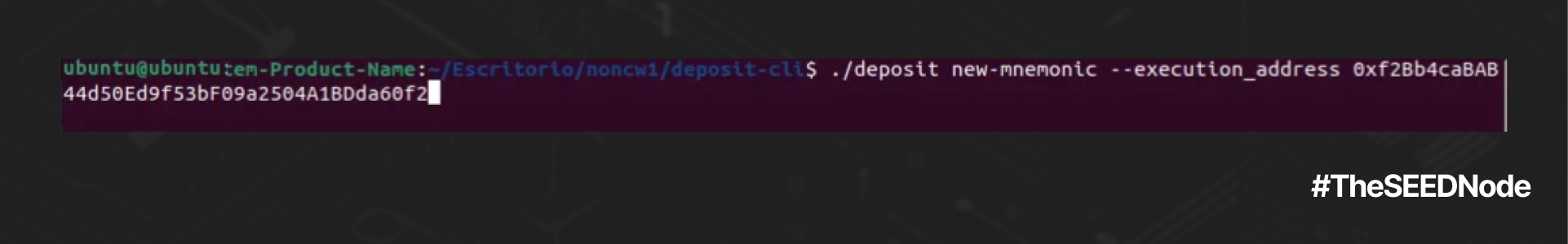 Creamos una nueva frase mnemónica utilizando el comando “new-mnemonic” del cliente. Mantendremos los argumentos al mínimo y permitiremos que la aplicación nos guíe. El único argumento necesario es “-execution_address”, ya que si no lo agregamos, el cliente no nos lo solicitará y dejará la credencial “withdrawal address” en “0x00” en el archivo “deposit-data”. Como se mencionó en el artículo anterior, esto no es una práctica recomendada. La dirección que sigue al argumento “-execution_address” es la dirección de retiro.