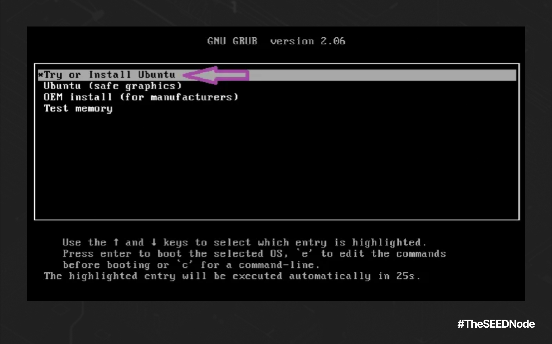 Una vez que hayas seleccionado el USB de Ubuntu Live, si no hay ningún error, verás aparecer el menú GRUB. En algunos casos, el sistema continuará automáticamente. Sin embargo, si no lo hace, simplemente selecciona la primera opción del menú y presiona ENTER.