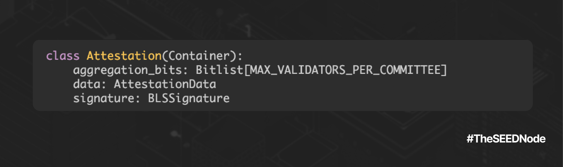 aggregation_bits: una lista de bits de validadores donde la posición marca el index del validador en su comité seguido del valor (0/1) que indica si está de acuerdo con la información.