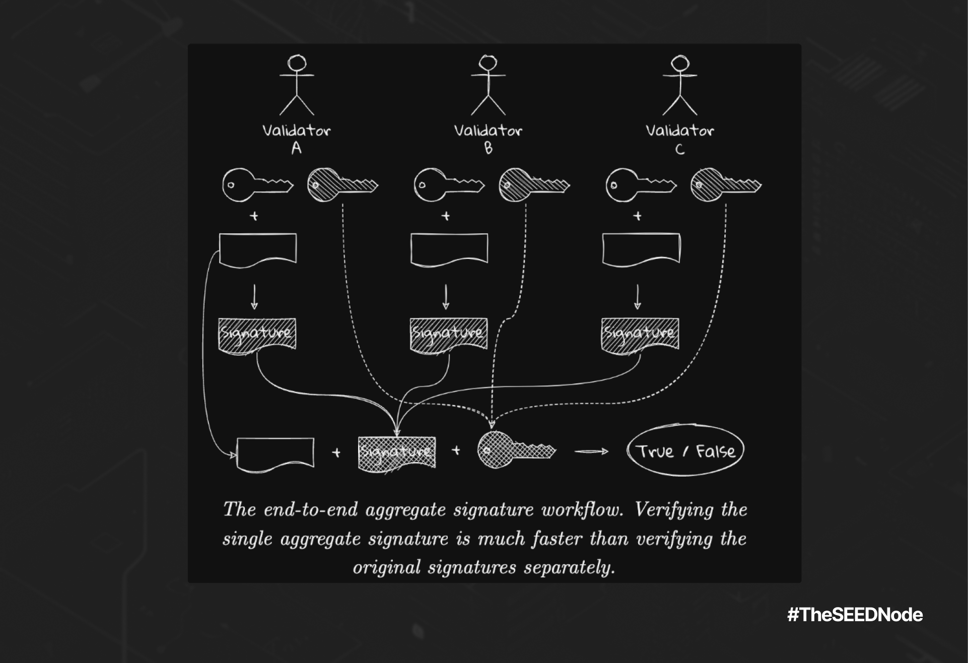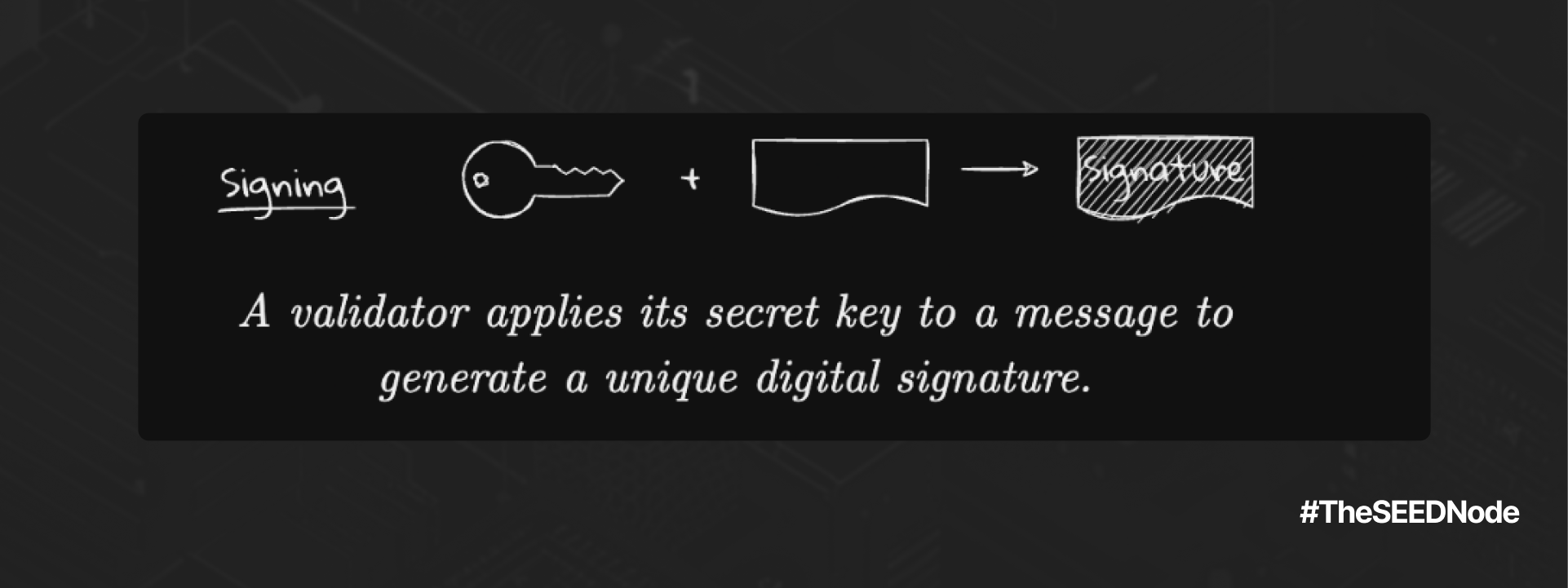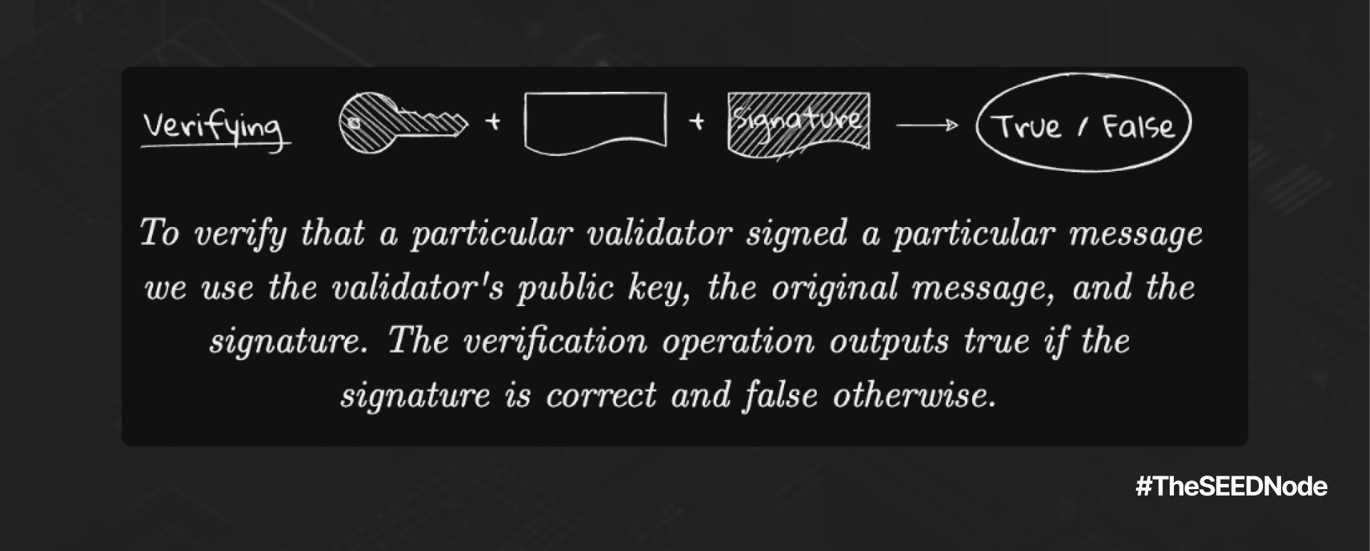 Algo importante de este proceso es que el mensaje, su firma y una llave pública permiten que verifiques el validador que firmó el mensaje ya que la llave pública deriva de la llave privada por lo que nadie más podría haber firmado ese mensaje.