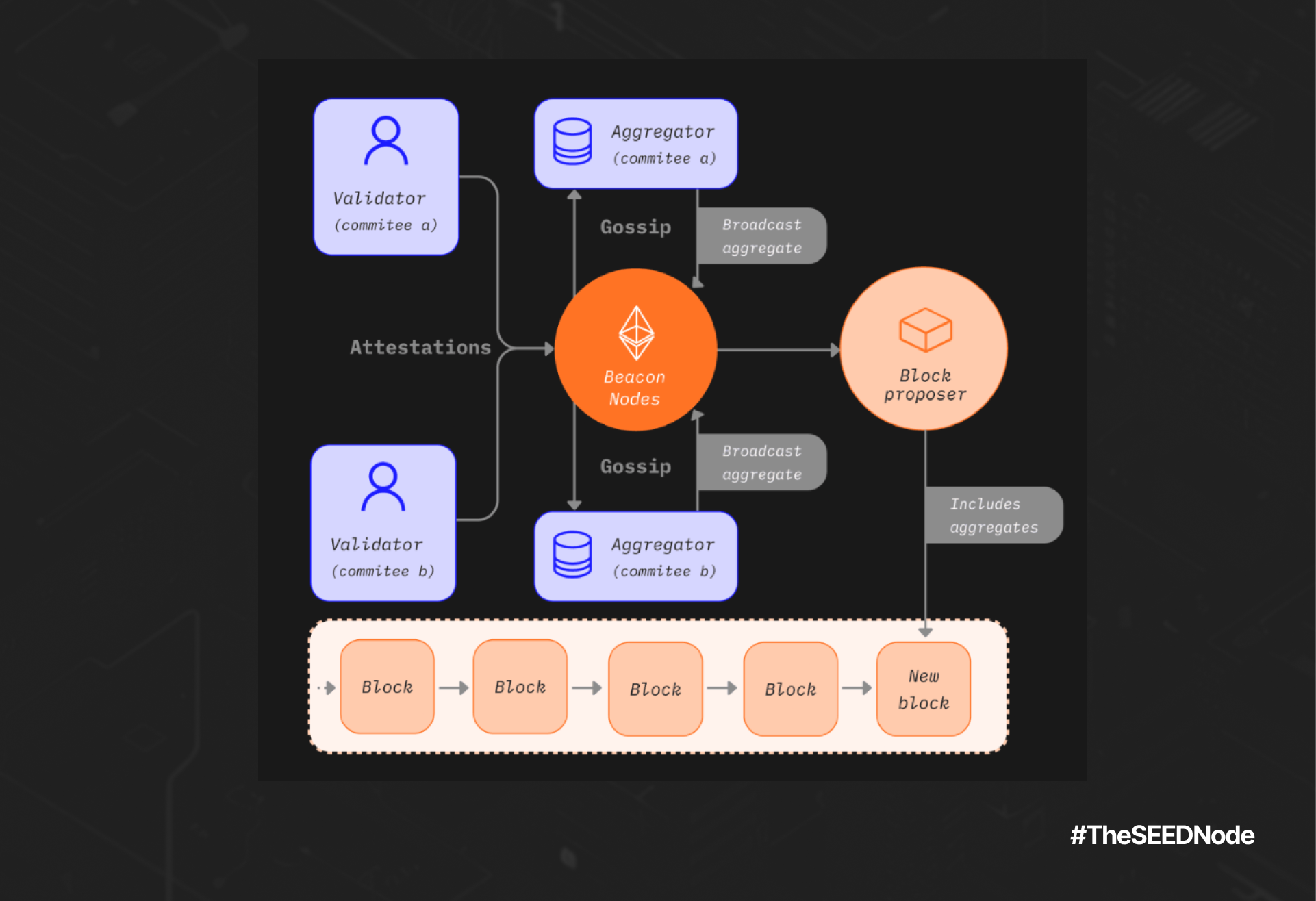 Propagation: Estas atestaciones se difunden a los agregadores a través de la red de difusión (gossip network).
