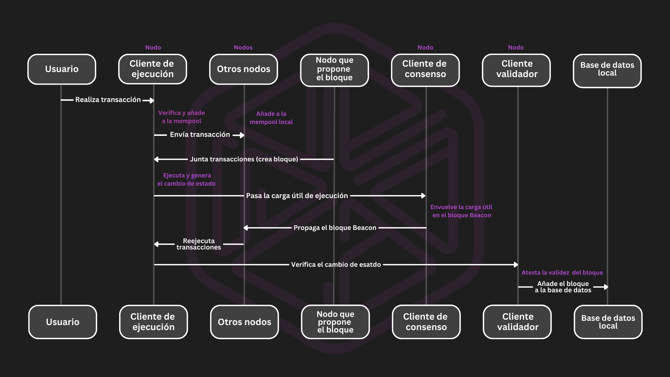 En este gráfico podemos observar como un usuario crea una transacción, y la misma es recibida por un nodo, específicamente por el cliente de ejecución de este nodo, este software luego verifica y añade a su mempool la transacción si esta es válida. Luego es enviada a otros nodos que también la añaden a su mempool local.