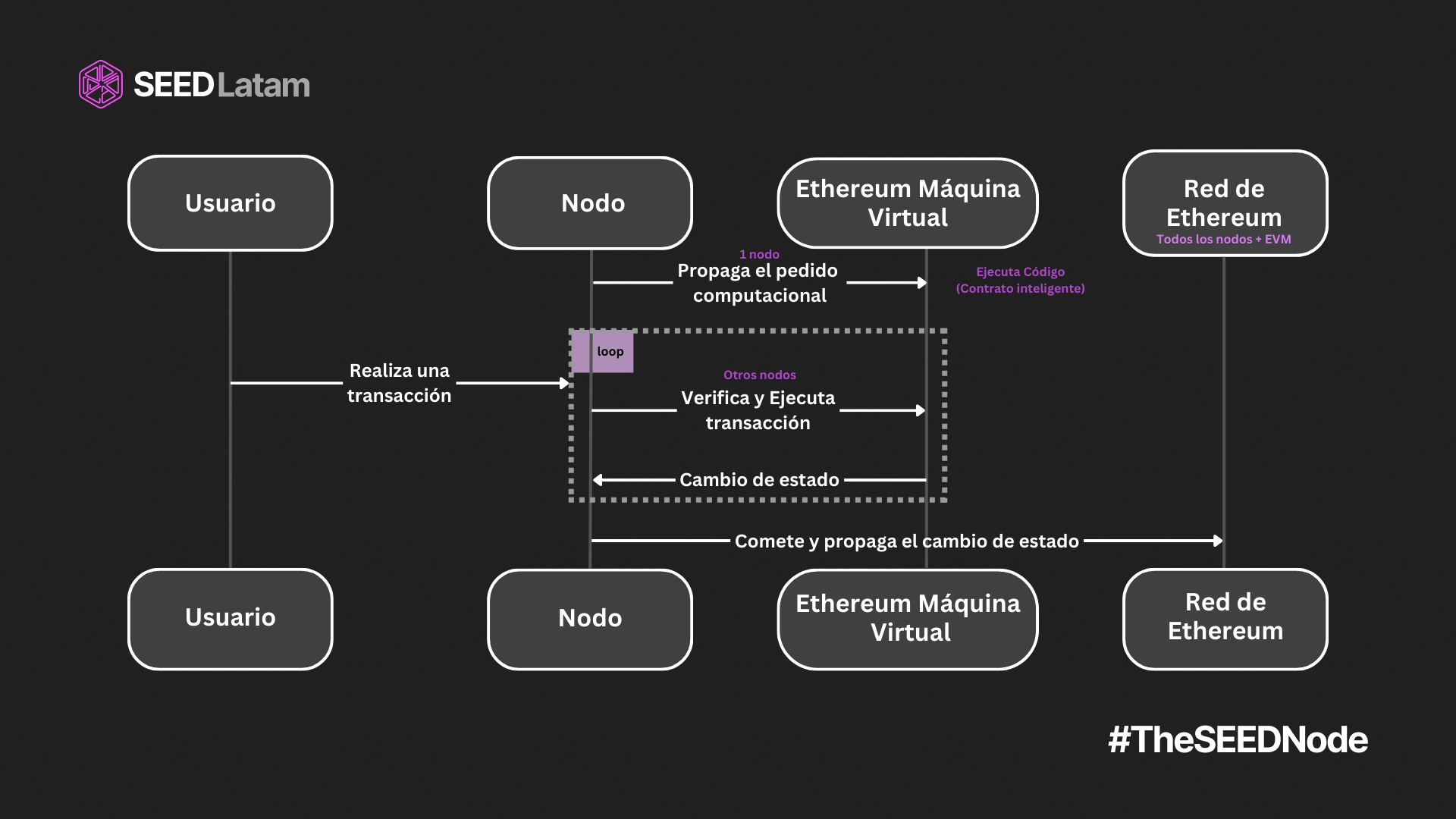Para seguir es importante que entendamos la arquitectura de la red, Ethereum es una cadena de bloques con una computadora incorporada (EVM), esta computadora es canónica y contiene todo el estado de la blockchain. Los nodos que pertenecen a la red actualizan el estado de la EVM al verificar, validar y ejecutar las transacciones recibidas. En el siguiente cuadro podemos observar cómo se procesa a grandes rasgos una transacción en Ethereum Pos.