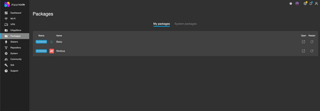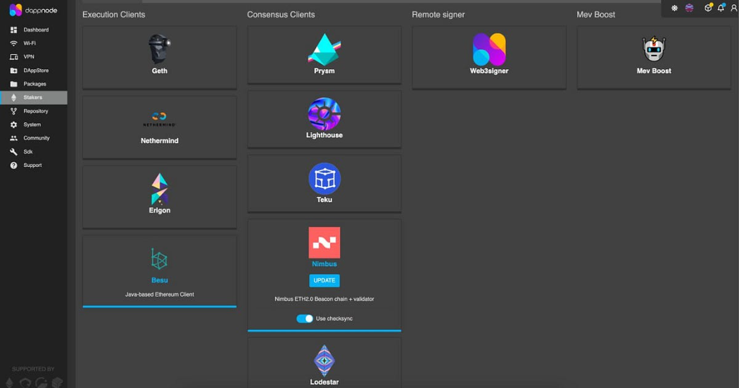 Una vez que elegiste el cliente a utilizar, llega el momento de instalarlo en DappNode para poder utilizarlo. Esta parte es muy sencilla, te mostramos cómo se vería en pantalla: