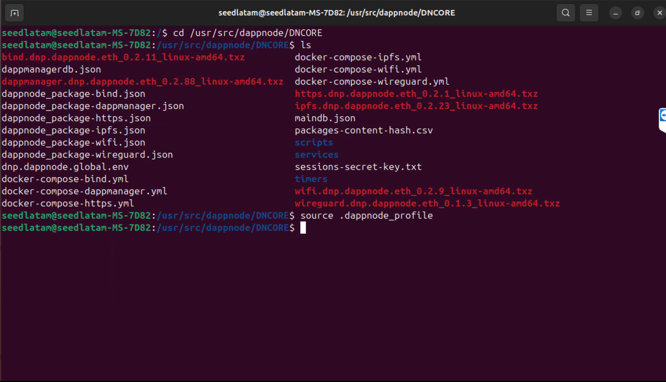 5. Dentro de la carpeta DNCORE, vas a ejecutar el comando “source” para que configure las variables de entorno: