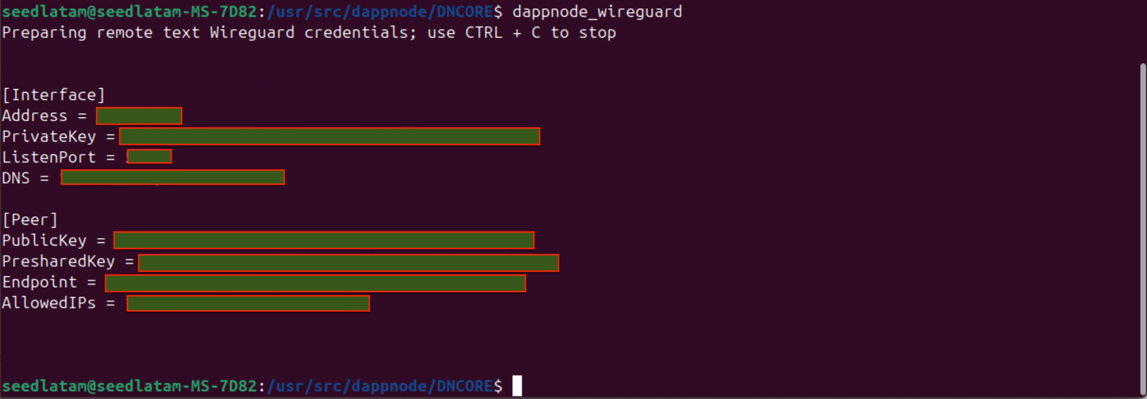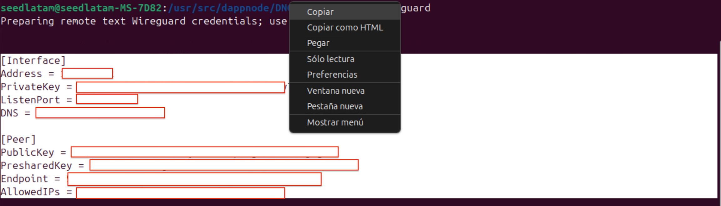 9. Ver las credenciales de Wireguard VPN, que luego te permitirán conectarte a my.dappnode, con el siguiente comando: