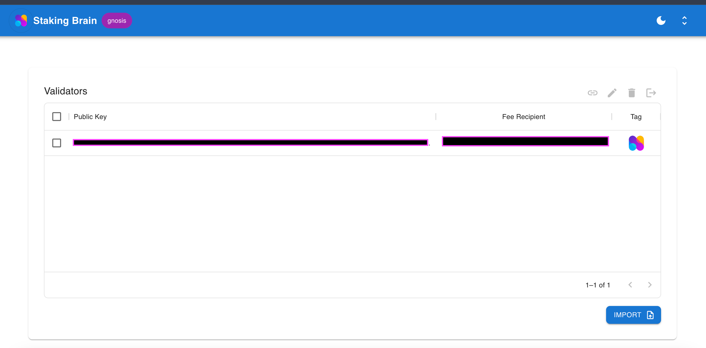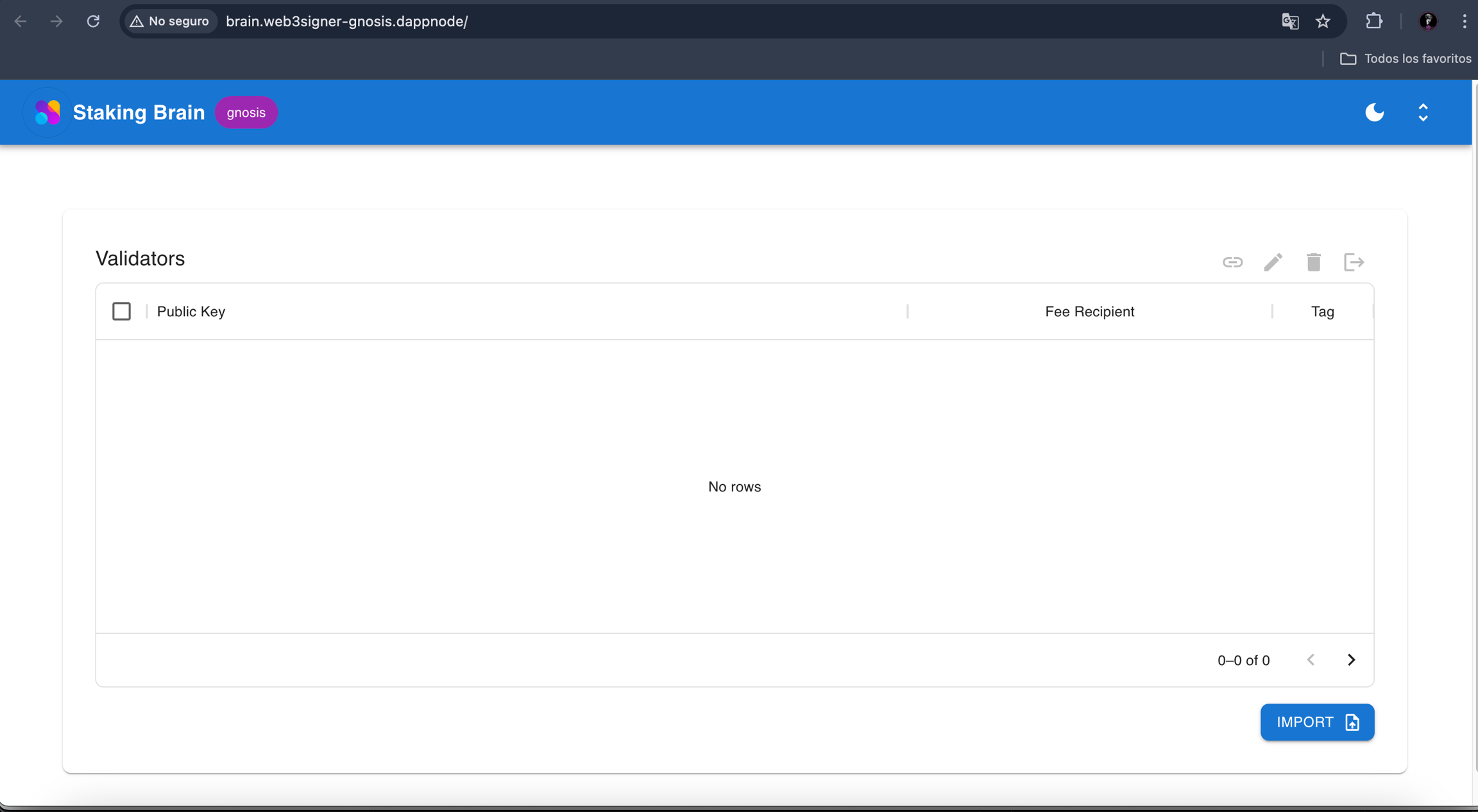 Para ver el proceso se debe copiar la Public Key que vemos en brain.web3signer-gnosis.dappnode/ y la pegas en el buscador de https://gnosis.beaconcha.in/