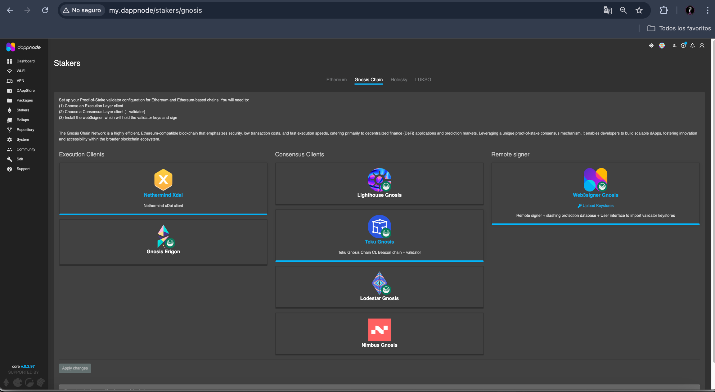 17. Selecciona el cliente de ejecución y consenso que prefieras, así como Web3signer Gnosis, y para finalizar, haz clic en "Apply Changes".