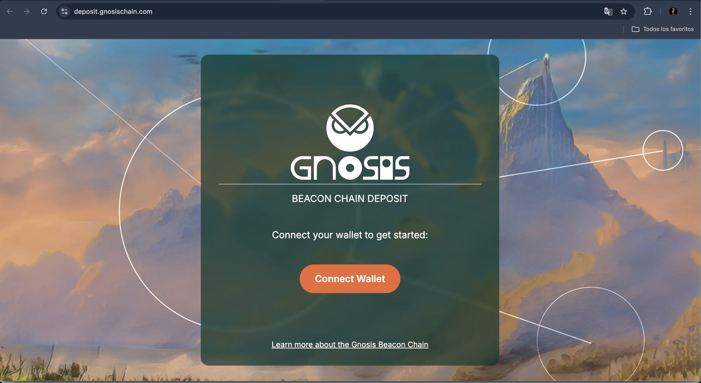 24. Luego vamos a: https://deposit.gnosischain.com/ y conectamos la wallet que proporcionaste en Gnosis Wagyu Key gen como ETH Withdrawall