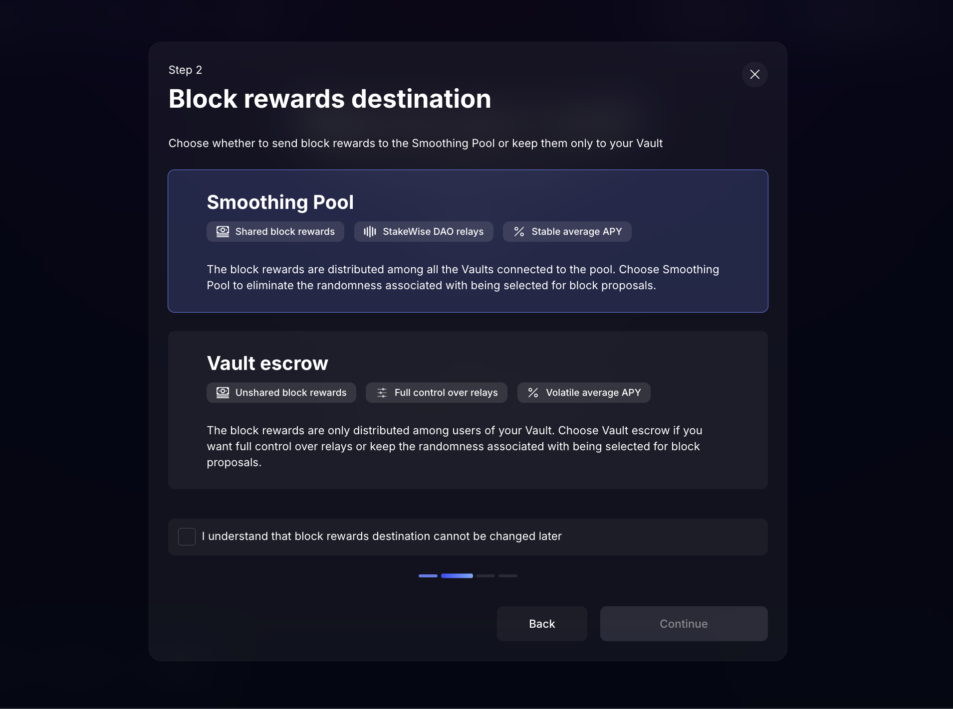 "Smoothing Pool" recolecta las recompensas de propuestas de bloques de los validadores participantes (Vaults) y las distribuye periódicamente de forma proporcional. Esto permite que incluso los Vaults más pequeños reciban pagos regulares. A cambio, cuando un Vault obtiene una recompensa de bloque, también se comparte con los demás. El beneficio principal es mantener un nivel constante de recompensas y un APY estable."Escrow" permite a un Vault obtener recompensas de bloques de forma independiente, usando cualquier relay de su elección, sin compartir recompensas con otros Vaults. Esto le da libertad para construir sus propios bloques. Sin embargo, los Vaults con pocos validadores pueden experimentar un APY más volátil debido a la aleatoriedad en la asignación de bloques.