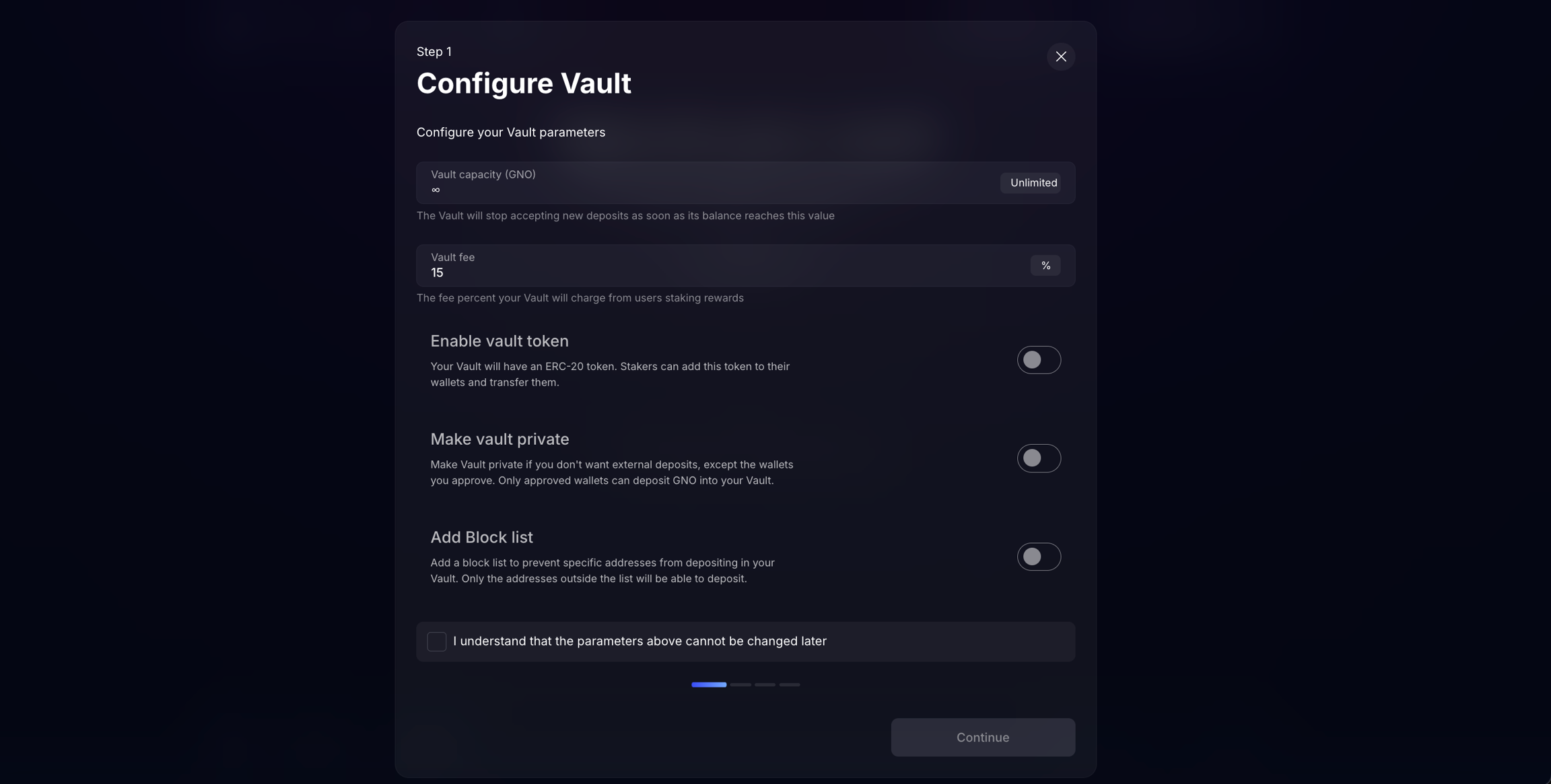 Hacer que la bóveda sea privada: Haz que Vault sea privado si no quieres depósitos externos, excepto los de las billeteras que apruebes. Solo las billeteras aprobadas pueden depositar GNO en tu Vault.
