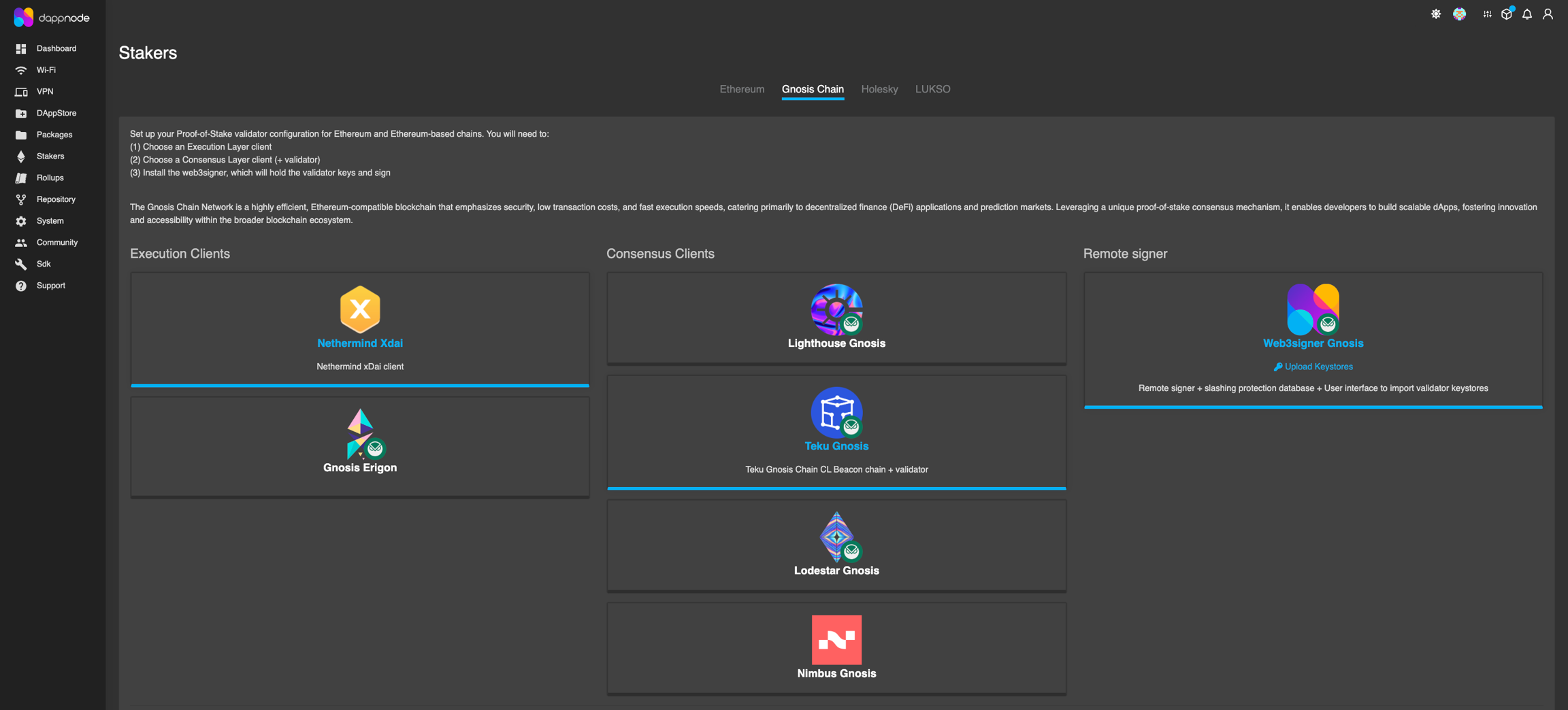 1. Vas a conectarte a DappNode [ https://welcome.dappnode.io/ ]. En el caso de nuestra guía, se va a hacerlo mediante VPN. Una vez asegurada la conexión por VPN, desde el navegador ingresa a: http://my.dappnode/stakers/gnosis