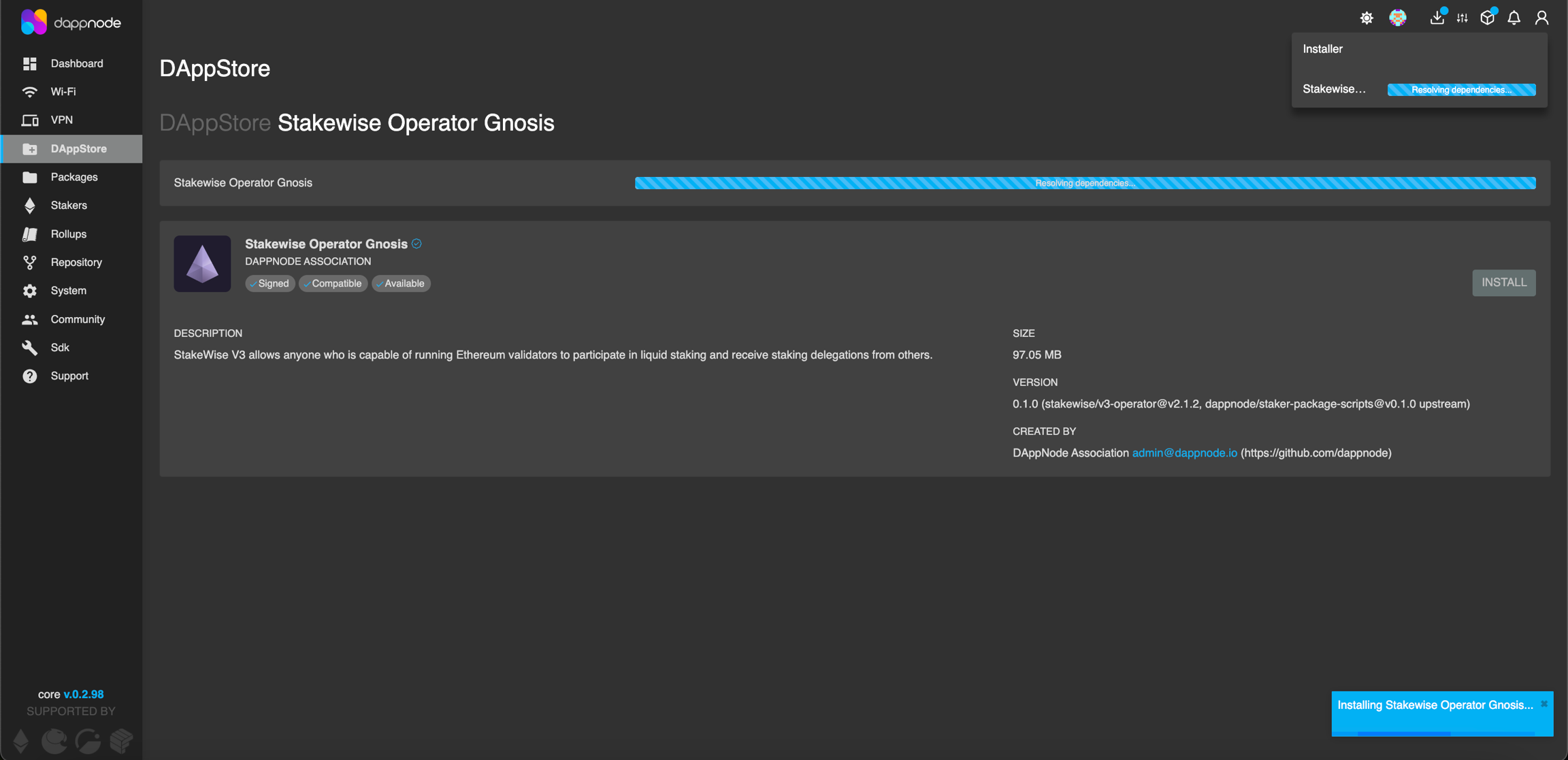 🫂 El número de validadores que se cargue en DappNode es recomendable que sea mayor a 10 o 20! ¿Por qué? A medida que nos stakeen GNO, StakeWise automáticamente va a crear nuevos validadores pero solo hasta el numero que hayamos dejado seteado. Si este numero se supera, deberemos modificarlo. Esto requiere descargar el backup nuevamente y actualizar la configuracion de nuestro Vault de Stakewise con el nuevo deposit_data_new.json.5. Se espera a que termine de instalar: