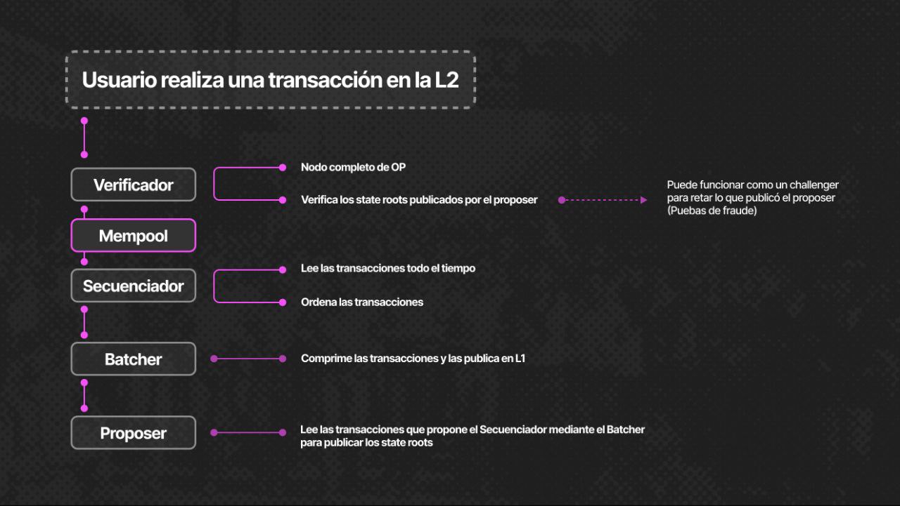 Minutos después, el “batcher” toma el rol de procesar los bloques utilizando métodos de compresión a modo de batches y publicarlas en la L1, para luego el “proposer” leer las transacciones publicadas y estados resultantes por el “batcher” y emitir los “state root” que luego también se publican en la L1 para el conjunto de bloques y batches involucrados. El “state root” es una representación del estado actual de la cadena L2 y dictamina los puntos de referencia para confirmar validez de las transacciones y habilitar más tarde comunicación entre L2 y L1, tales como los retiros. Por último, el verificador como observante de la red, lee los "state roots" que el “proposer” ha publicado y es capaz de detectar inconsistencias. Idealmente, puede actuar como un "challenger" para cuestionar lo que el “proposer” ha publicado en caso de detectar alguna irregularidad, utilizando las pruebas de fraude, aunque esta última pieza todavía no está implementada en la versión de OP Mainnet.