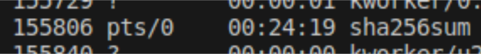Busca la entrada sha256sum en la columna CMD para encontrar el proceso correspondiente. Durante nuestras pruebas, el tiempo promedio fue de aproximadamente 30 minutos, aunque esto puede variar en función de la configuración de hardware utilizada